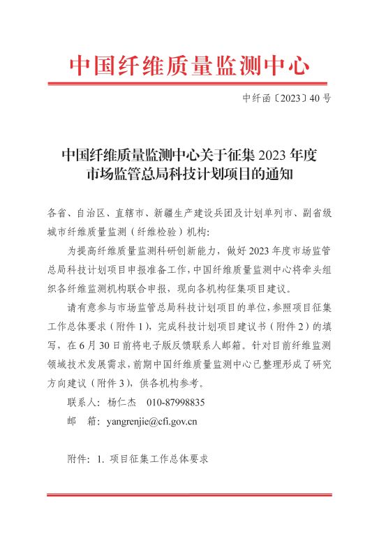 中国纤维质量监测中心关于征集2023年度市场监管总局科技计划项目的通知